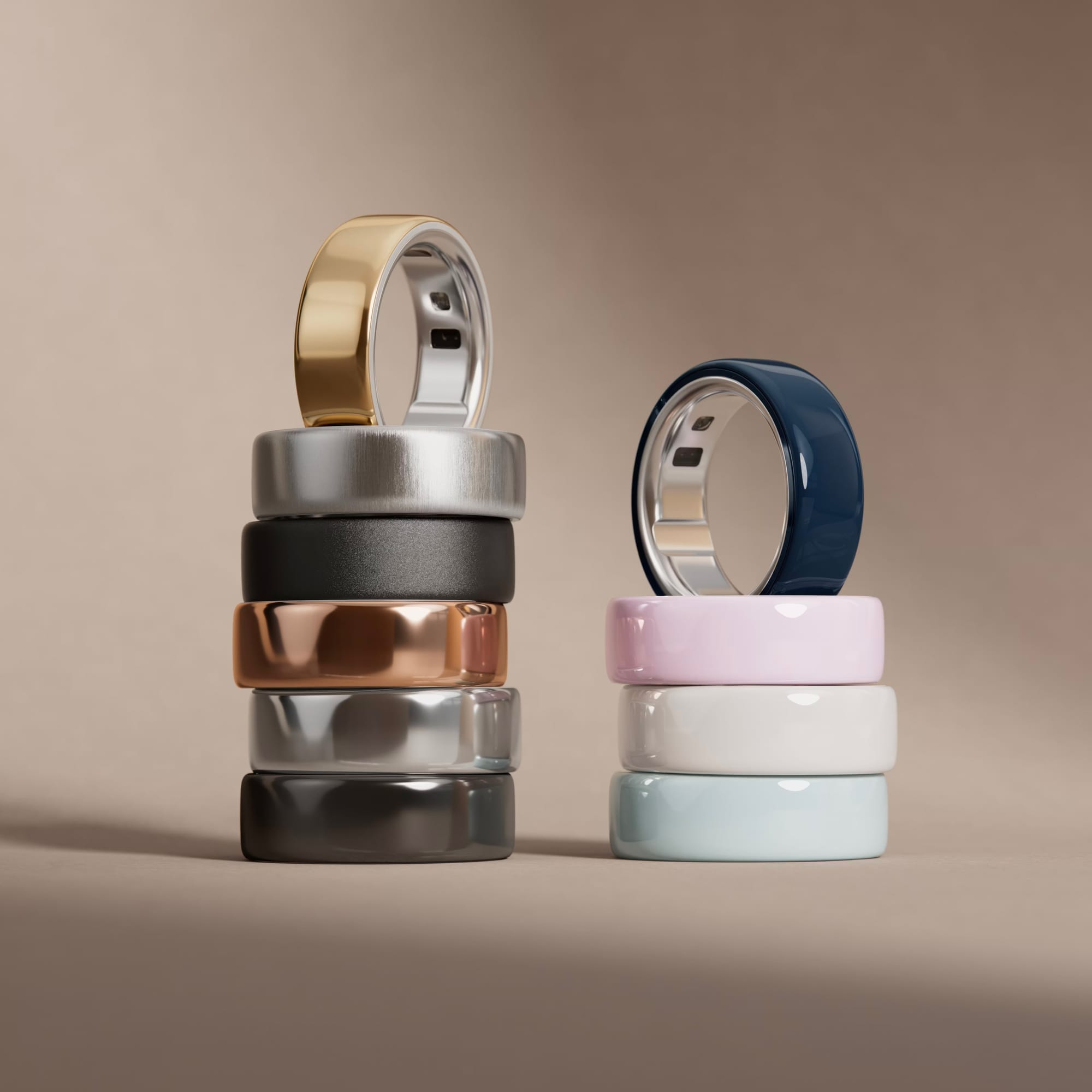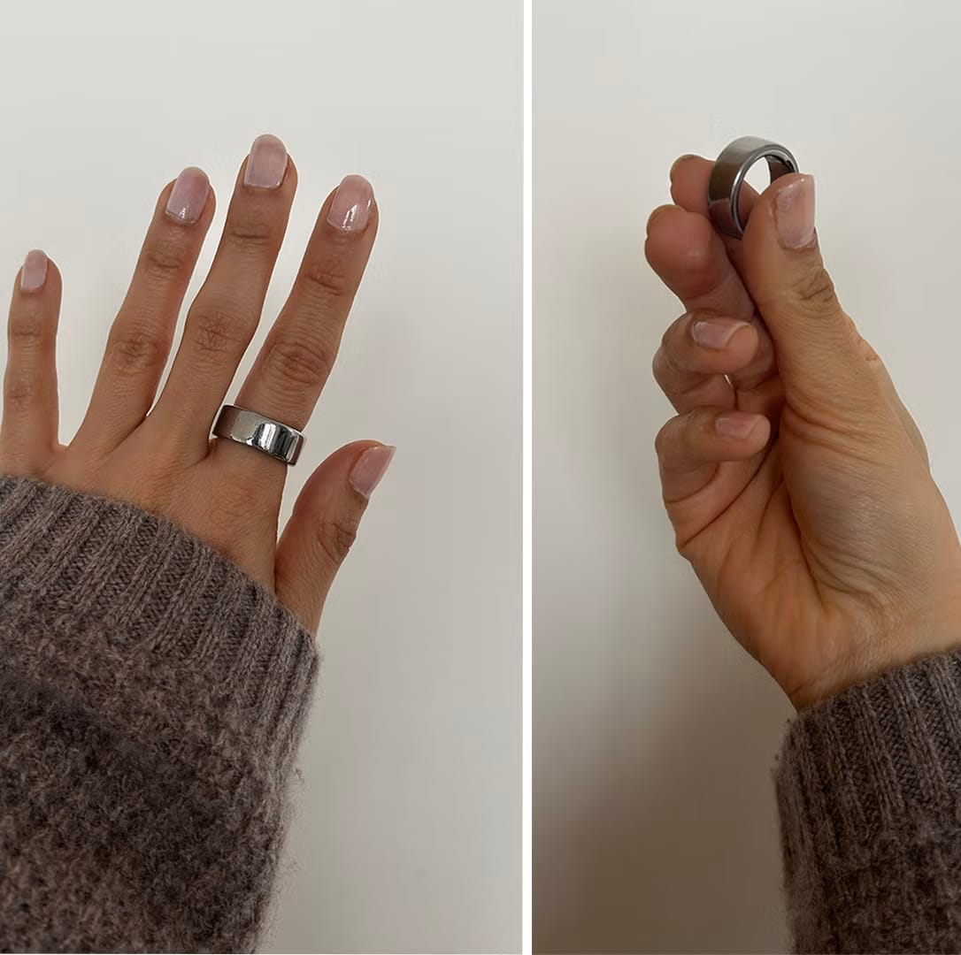 Это кольцо Oura. Это полноценная ювелирка, которую легче вписать в женственный образ, вечерний образ и которая поднимает нарядность любого повседневного образа. По-модному носить его нужно на указательном пальце (хотя технически можно носить на любом). Оно позиционируется как женское, акцентирует внимание на дневном стрессе и работает с циклом (whoop тоже работает с циклом и даже лучше, но позиционируется больше как спортивный гаджет). Годовая подписка стоит всего 70 долларов, но зато само устройство платное, топовая модель стоит 500 долларов. На мой взгляд визуально Oura не имеет преимуществ дизайна перед кольцами азиатских производителей, в отличие от Whoop.